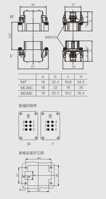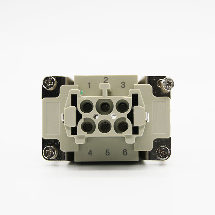 :HE-006-FP ·工作电流 : 16A ·工作电压 : 500V ·额定脉冲耐受电压 : 6KV ·绝缘电阻 : 10⁴MΩ ·工作温度 : -40℃--+125℃ ·阻燃等级 : V0(UL94) ·适用壳体 : H6B